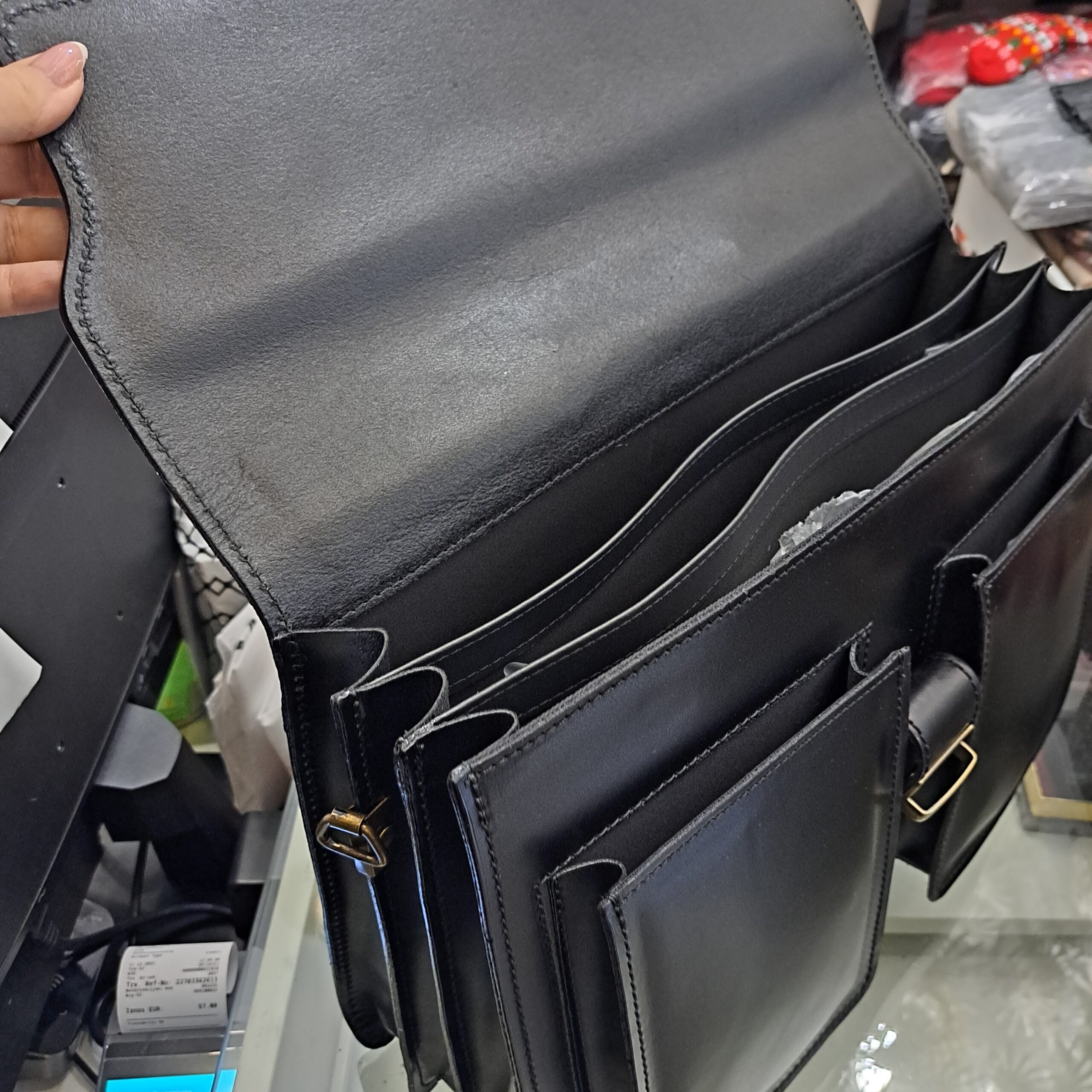 Torba se nosi pomoću kratke ručke u ruci ili podesivog remena na ramenu.Torba se zatvara pomoću kopče.Unutrašnjost torbe čine 4 pretinca .Sa stražnje strane torbe nalazi se vanjski džep koji se zatvara pomoću zatvarača,a sa prednje dva džepa.